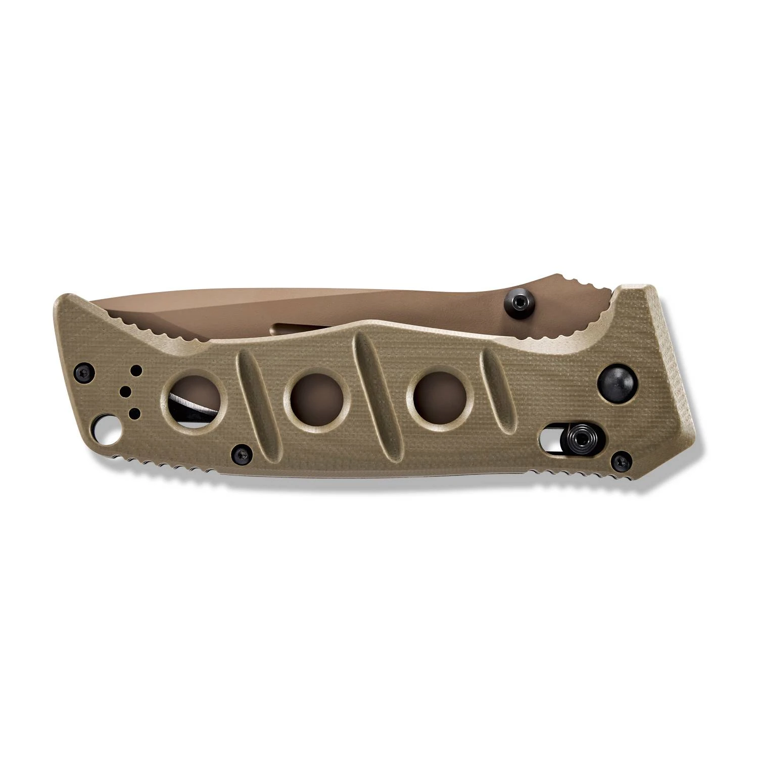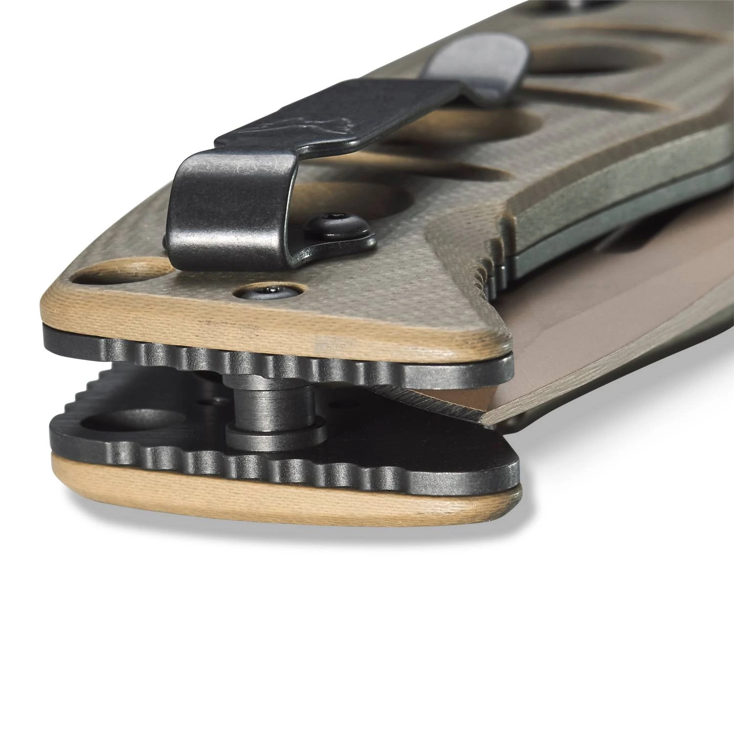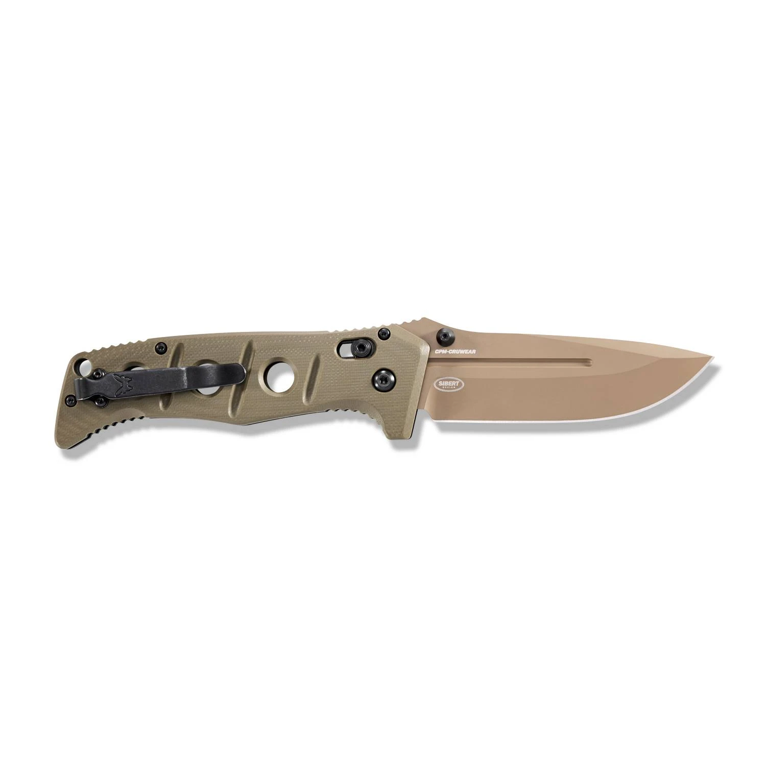 Ruggedly designed and ready for action, the Benchmade 275FE-2 Adamas Knife features an expertly crafted drop point blade that’s sharp enough to shave with. A durable machined G10 handle stands up to everyday use, while a reversible deep-carry clip keeps your knife within arm’s reach. This OD folding knife is MOLLE compatible and can be strung from a lanyard for concealed carry.