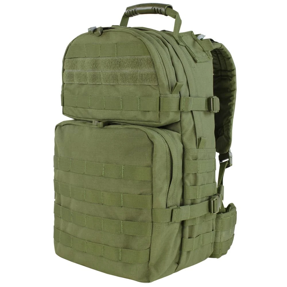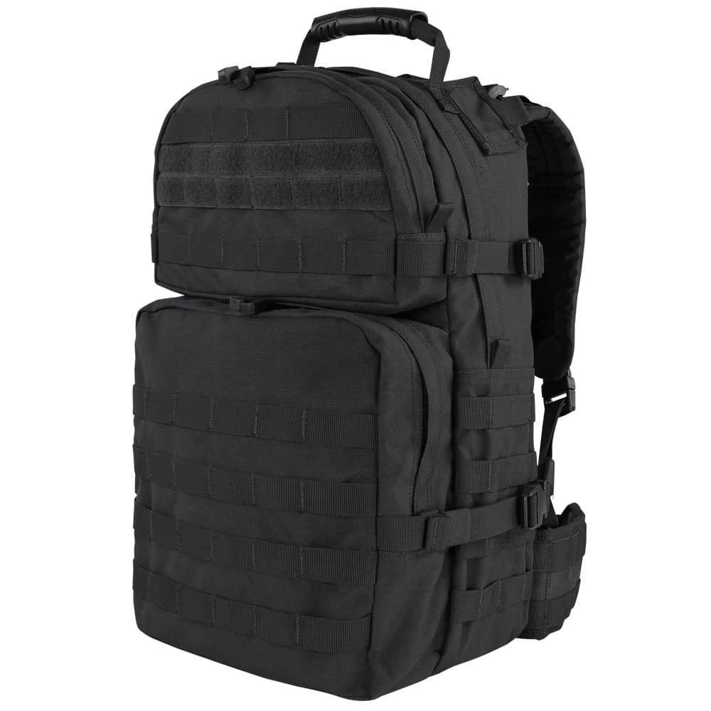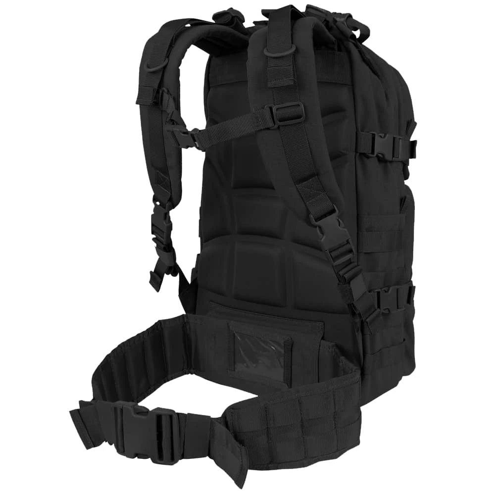 Measuring 19″H x 12″W x 9″D, this medium-sized assault pack from Condor features external side compression straps, a heavy-duty carry and drag handle and double zipper compartment pulls. There is also heavy weight webbing over the entire pack, including on the side waistband, for modular attachments. Plus, the back panel is compression-molded for an incredibly stable platform from which to operate.