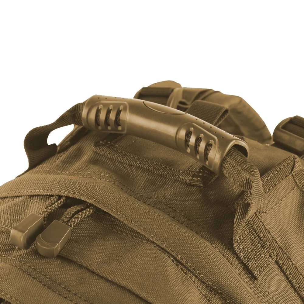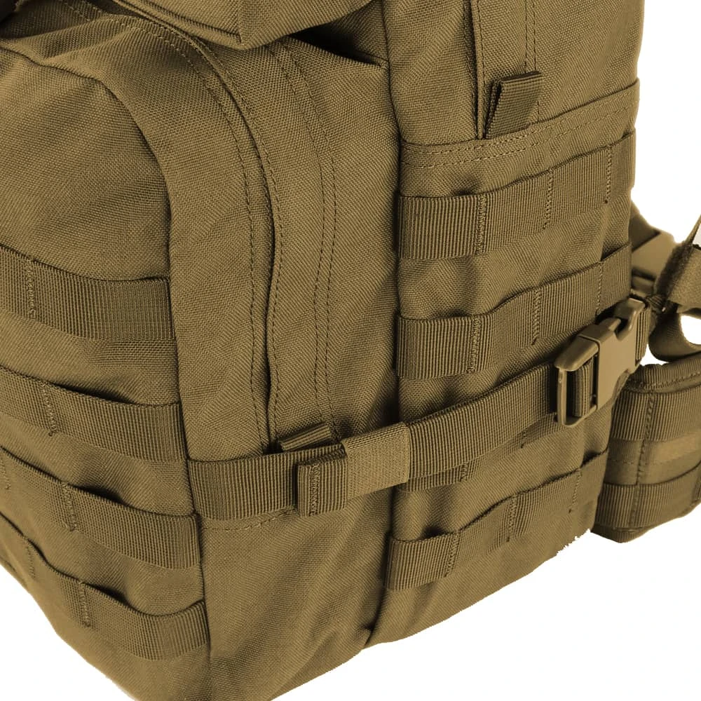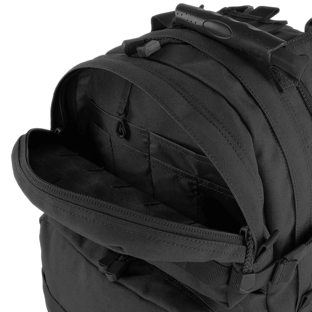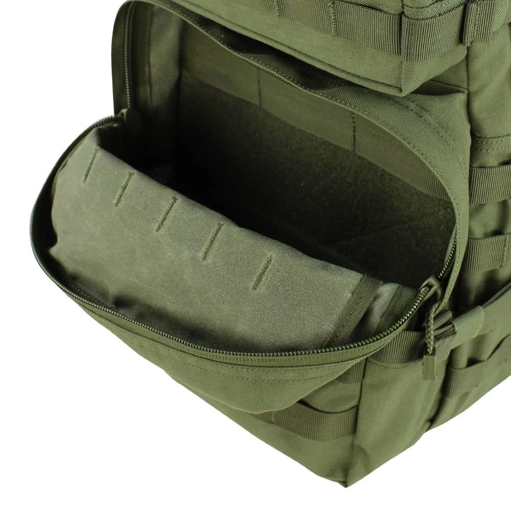 Measuring 19″H x 12″W x 9″D, this medium-sized assault pack from Condor features external side compression straps, a heavy-duty carry and drag handle and double zipper compartment pulls. There is also heavy weight webbing over the entire pack, including on the side waistband, for modular attachments. Plus, the back panel is compression-molded for an incredibly stable platform from which to operate.