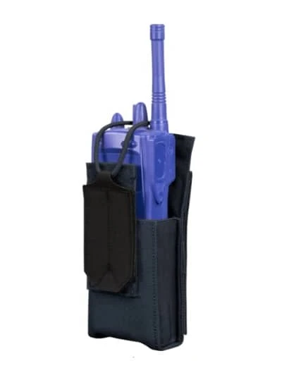 A 4-inch-tall pocket with elastic sides, hook and loop flap, and adjustable bungee retention can accommodate most public safety and handheld radios between 6.5- and 7.5-inches x 2.375 inches x 1.625 inches.