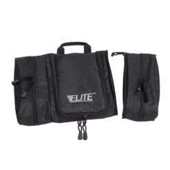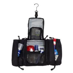 The Elite Survival Systems Travel Prone Toiletry Kit features a low-profile design that fits easily into your luggage or backpack. The clamshell zip main compartment folds out to reveal an integrated hanger and mesh pockets for larger items. Two waterproof side pockets keep your liquid items from leaking on your belongings and the right-side pocket can be removed when space is limited.