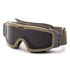 The ESS Low Profile NVG Tactical Googles 2 Lens Kit is a battle-tested military/tactical goggle authorized by the U.S. Marine Corps, U.S. Army, U.S. Air Force, and NATO governments. It is designed with input from U.S. Special Forces and is renowned for its low-profile, night-vision-compatible frame with features like extra-thick polycarbonate lenses for maximum impact protection and anti-fog coatings. The goggle also boasts a ventilation and filtration system for fog prevention and particle filtration. It is compatible with various prescription inserts and complies with multiple safety standards, including U.S. MIL SPEC, ANSI, CE, and U.S. Federal OSHA. The lenses offer 100% UVA/UVB protection and optical clarity.
