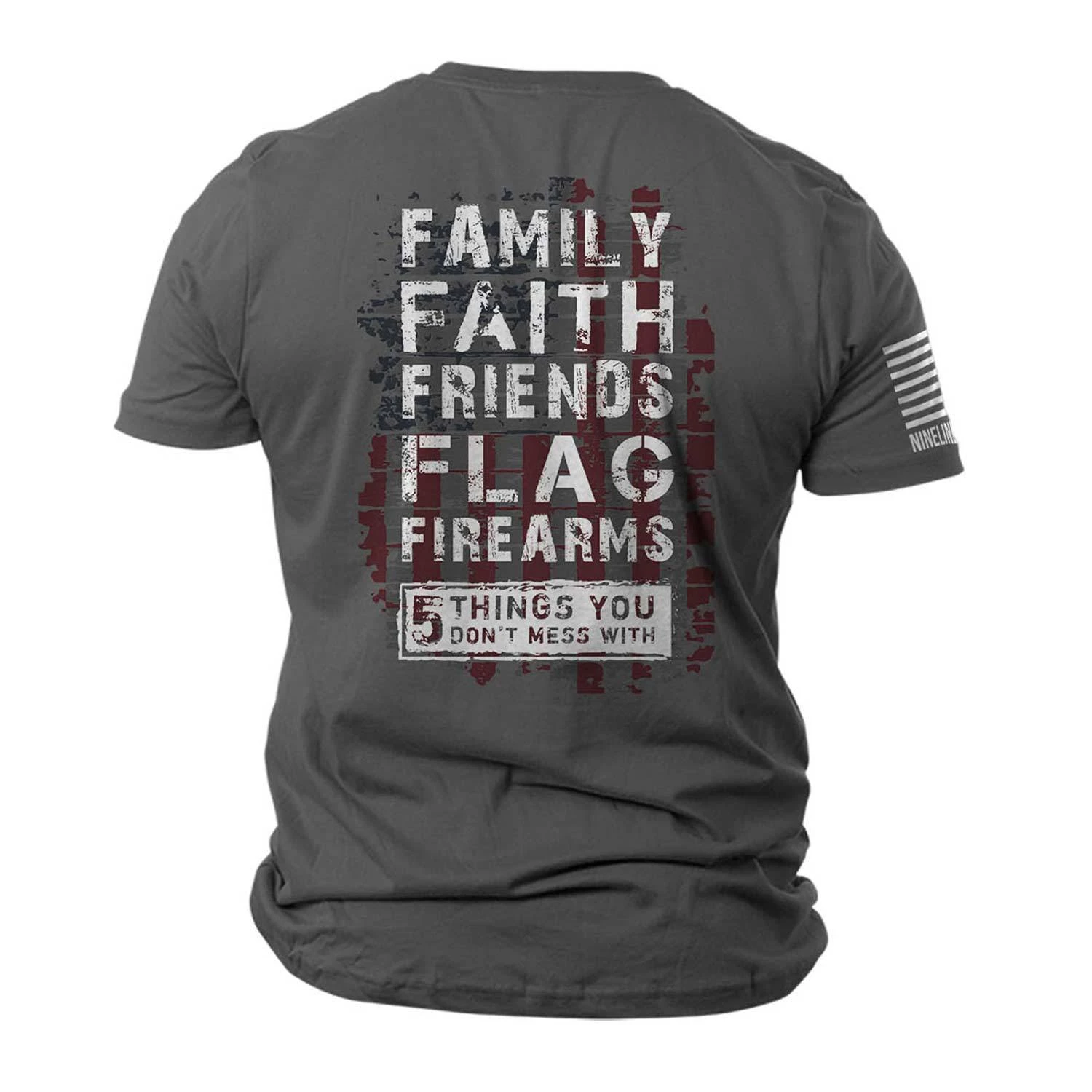 Show off your patriotism and pride with this 5 Things Tee Shirt from Nine Line. From the relentlessly patriotic Nine Line Apparel comes a statement sure to turn heads: Family, Faith, Friends, Flag and Firearms – 5 Things You Don’t Mess With in bold white letters over an American Flag background.