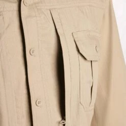 - Two pleated chest pockets include a hook and loop closure for secure storage