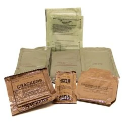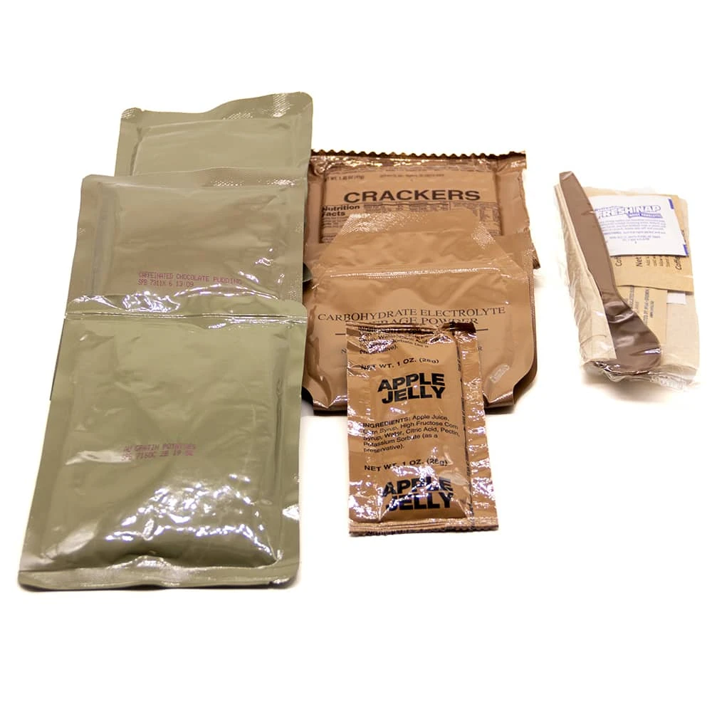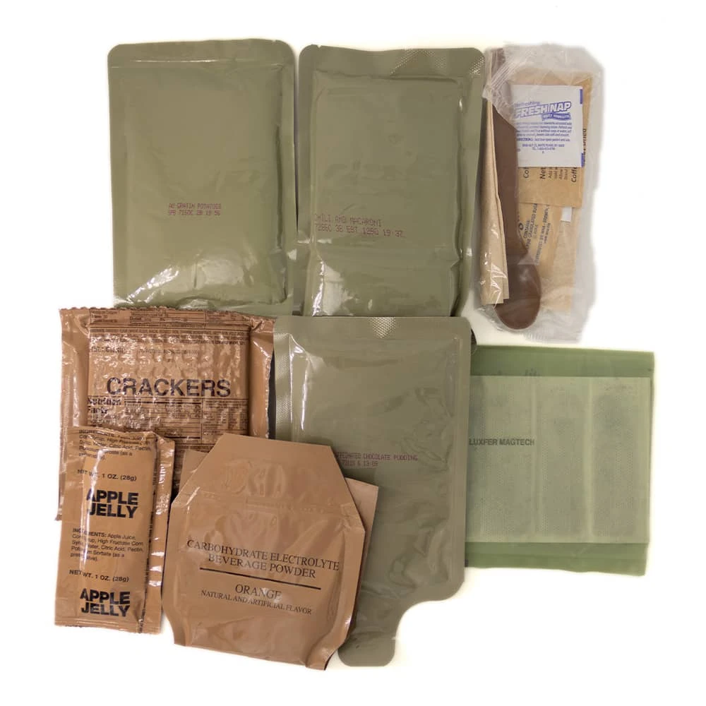 - Each meal includes an entree, side dish, dessert, crackers, spread, beverage, coffee, condiments, utensil and a water activated heating system