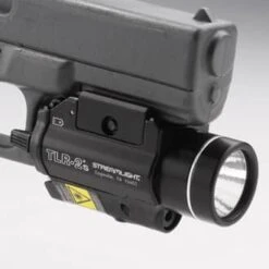 The Streamlight TLR 2s Flashlight with Strobe is a lightweight, compact, gun mounted tactical light powered by 2 CR123A lithium batteries. It features the latest shock-proof power LED technology and provides at least 2.5 hours of continuous run time in dual mode. The light can simultaneously provide LED and high-power visible laser output. The rail clamp rapidly attaches/releases from side of weapon, and tethered battery door prevents loss. Strobe can be activated by two or more momentary paddle hits. Flashlight provides 300 lumens measures system output.