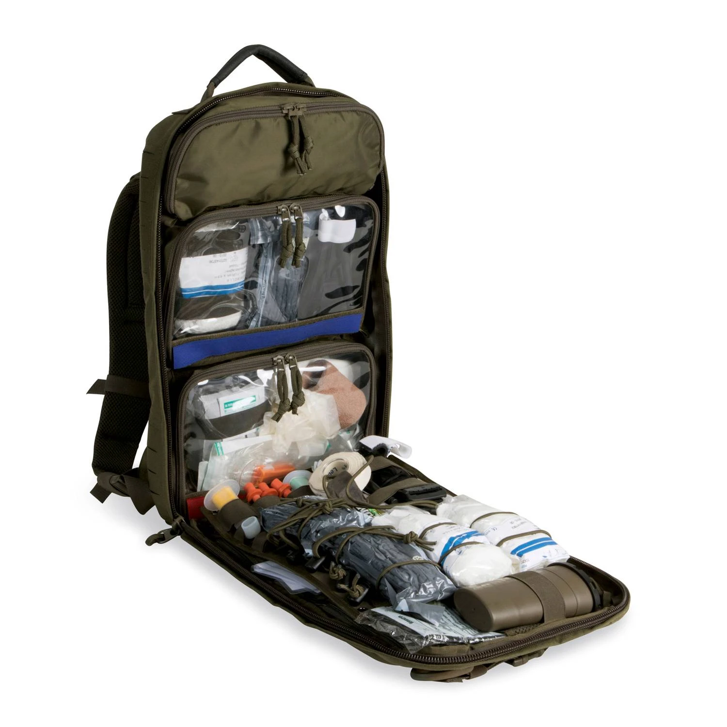 The Tasmanian Tiger Medic Assault Pack MKII allows you to see all your medical gear with clear inside pockets and provides smart organization with its internal fixation points. This medical backpack features padded lightweight shoulder straps that can detach and stow away in a hook-and-loop fastening pocket. The front and sides have laser-cut MOLLE for extending your bag’s capacity and will adapt to a panel carrier. Additionally, this MOLLE bag comes with stowable carrying handles for high-speed transportation during an emergency.