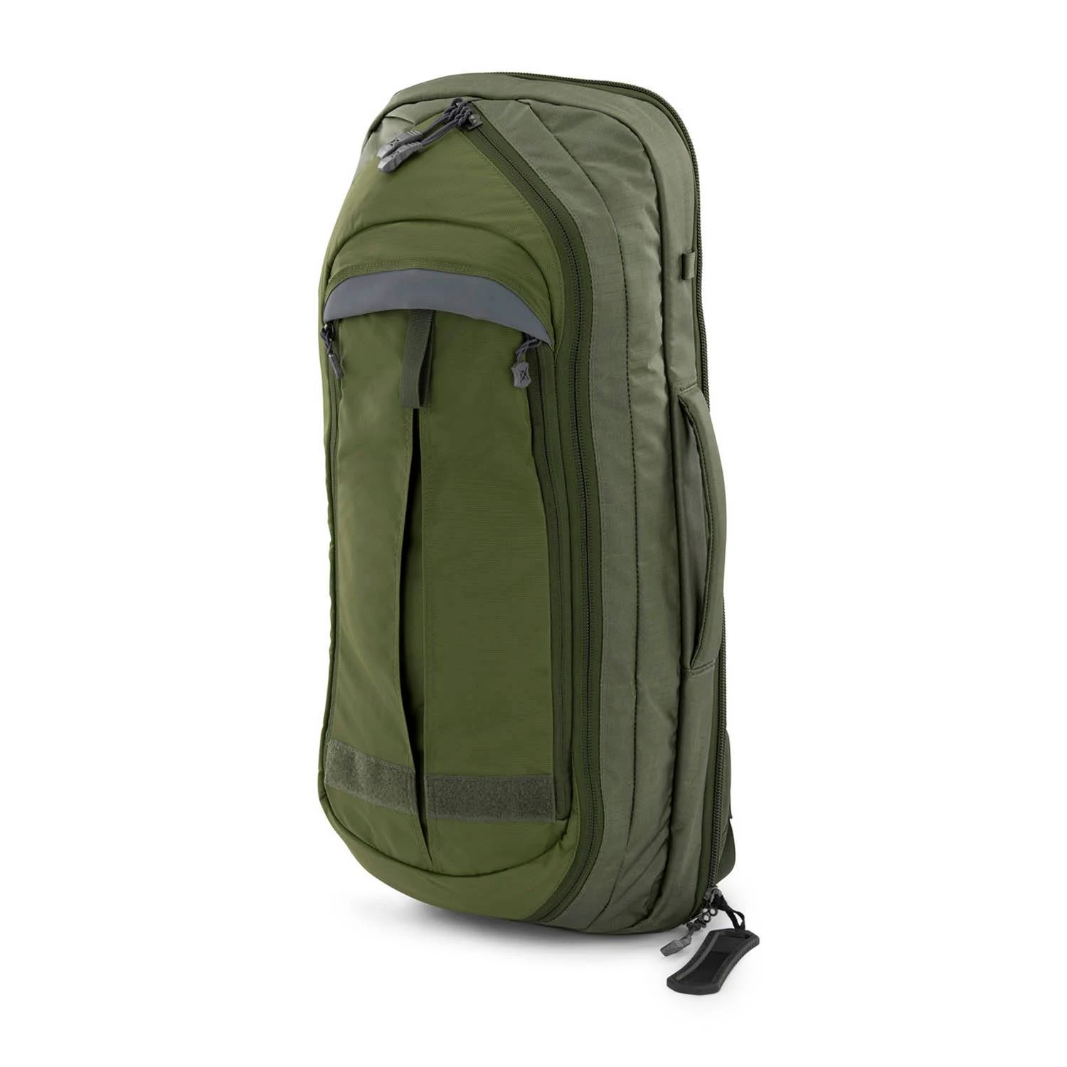 - Convertible front flap stows being loop faced MOLLE webbing panel to provide ready access to items mounted there and to rapidly change the bag’s appearance